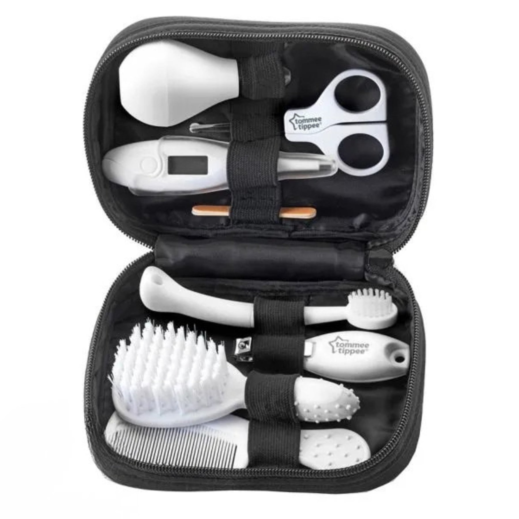 Toilettaska við fepurmátara, bust, kamb, neglasaks, neglaklippara, neglafílir, tannbust og nasasúgvara.