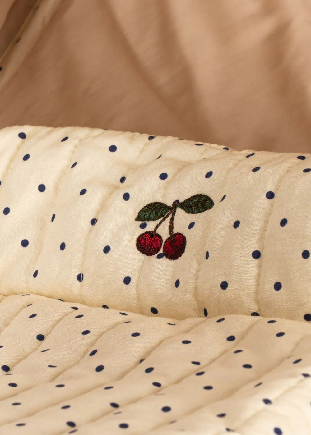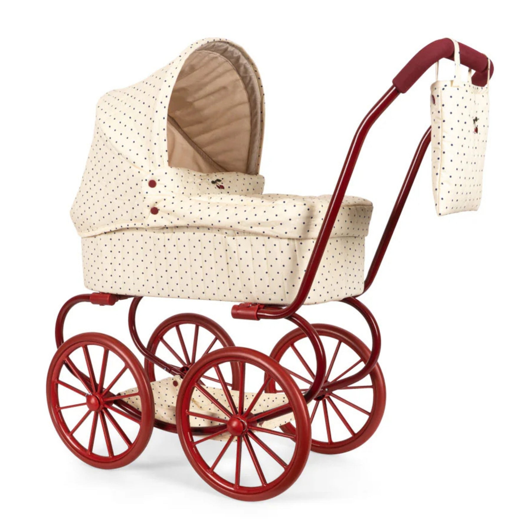 Dukkuvognur í vintage-stíli við fýra stórum hjólum, sum ger hann lættan og stabilan hjá smábørnum at ganga við. Vognurin er sniðgivin við kviltaðum fóðri, hevur eina mjúka madrassu og ein fóðraða vørukurv. Stellið er úr metalli og hevur mjúk handtøk.