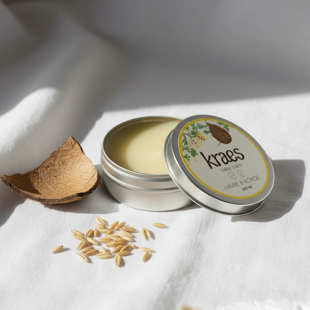 KRAES baby balm er eitt 100% natúrligt, mjúkt og feitt krem, sum verjir og røktar viðkvæma húð. Tað er serliga gott til turra og skriðandi húð – og er eisini gott eftir blæuskift, tá húðin hevur brúk fyri eyka verju.