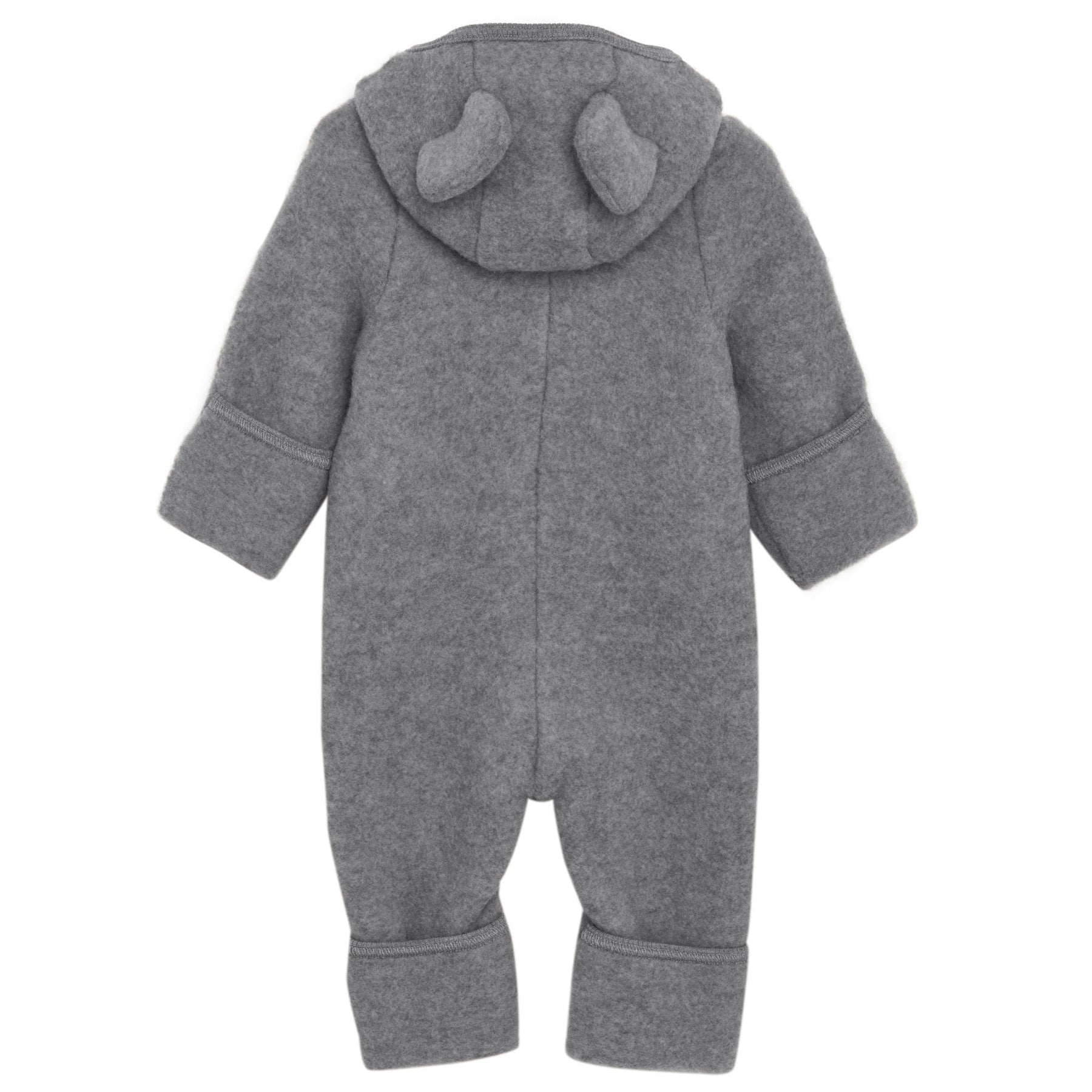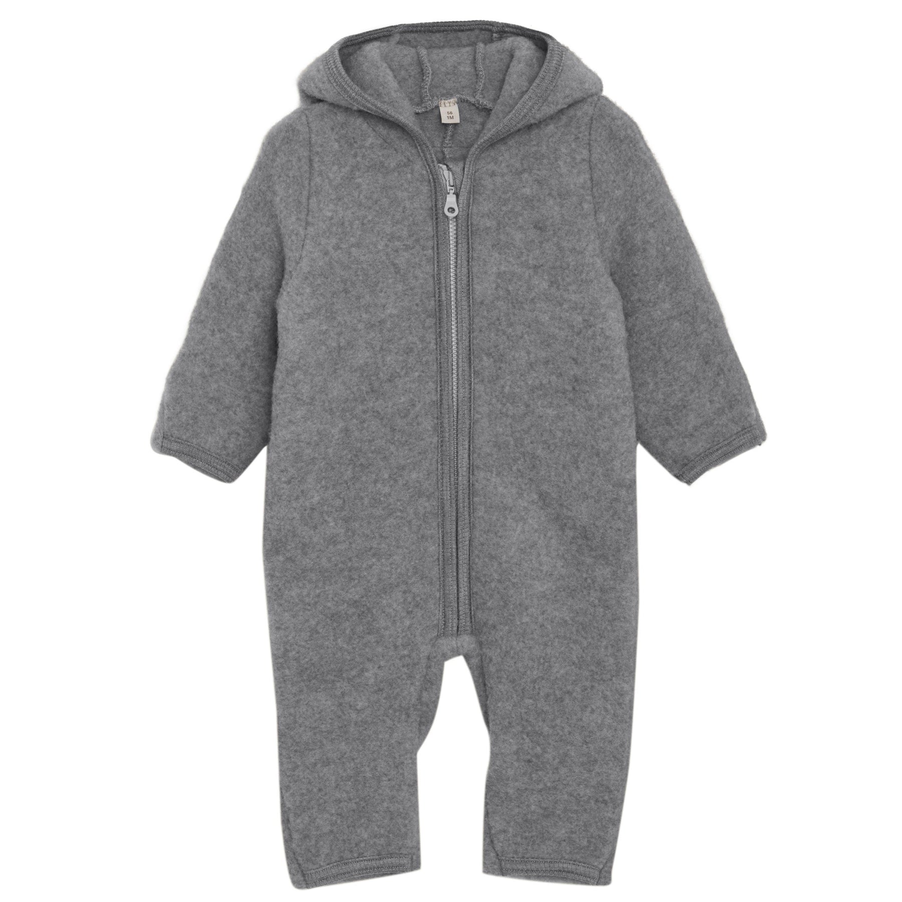 Snøgg og heit drakt úr merinoull frá HUTTEliHUT. Draktin hevur fasta hettu fittum oyrum á. Upp til stødd 80 eru praktiskar vendir í ermunum og við beinini, so smáar hendur og føtur halda sær heitar.