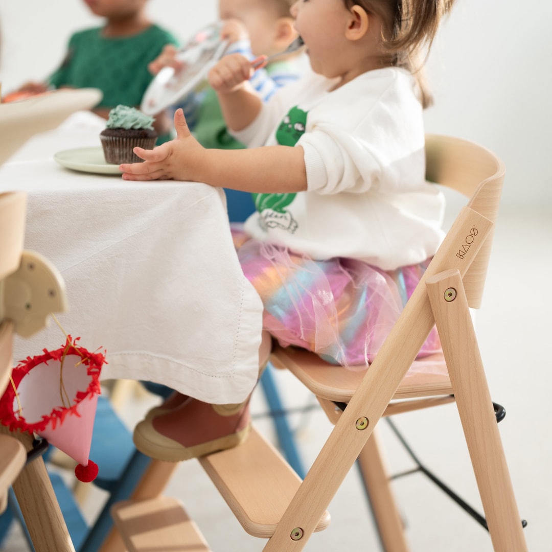 Borðstólur, sum kann klappast saman og brúkast til allar aldrar. Sniðið er trappu inspirerað, soleiðis at barnið kann sita natúrligt og ergonomiskt – uttan at nakað skal stillast.