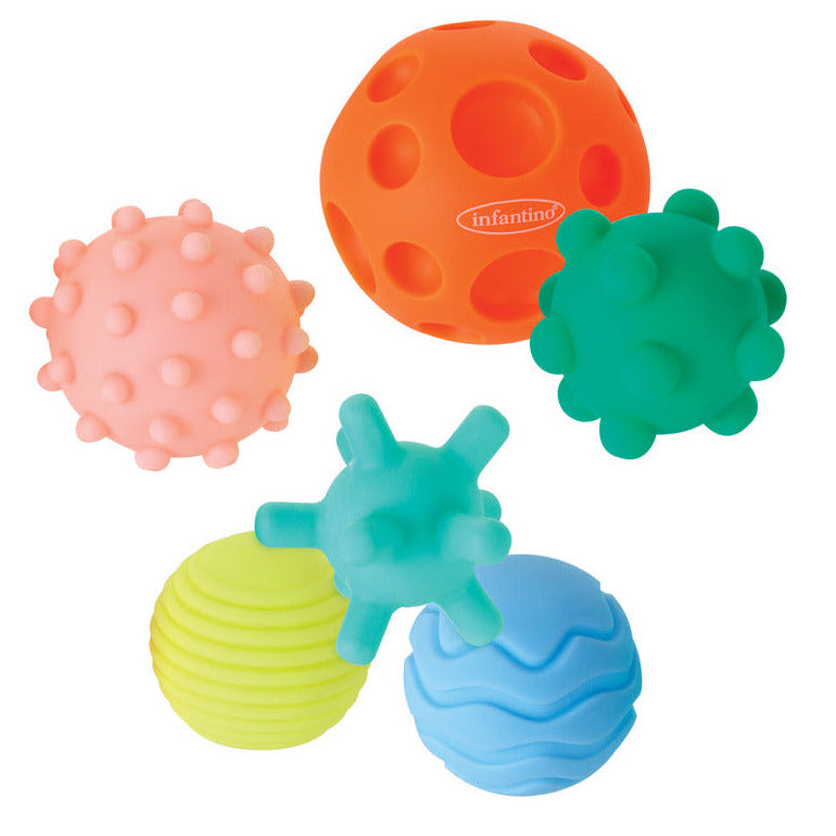 Mjúkt og sansaligt sett við 6 bóltum í ymsum litum og teksturum, gjørt til smábørn at kanna og spæla við.