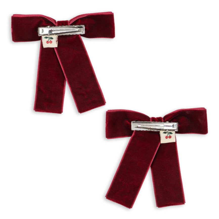 Tvær dekorativar hársloyfur úr mjúkari floyal, prýddar við fittum kirsuberum. Sloyfurnar hava klips aftan, sum gera tær lættar at seta í og taka av – góðar til at geva hárinum eitt vakurt og festligt look.