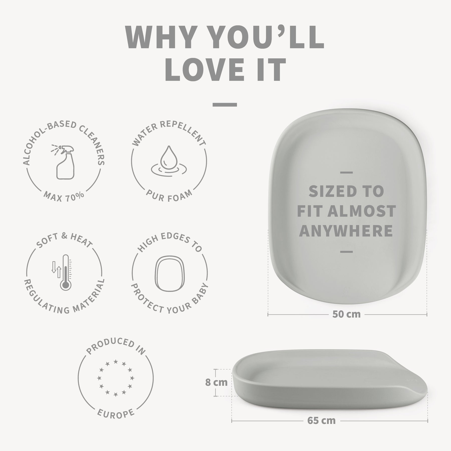 Fallegur skiptipúði sem er mjúkur, vatnsheldur og auðveldur í þrifum. Skiptipúðinn er mjög slitsterkur og þolir spritt allt að 70%.