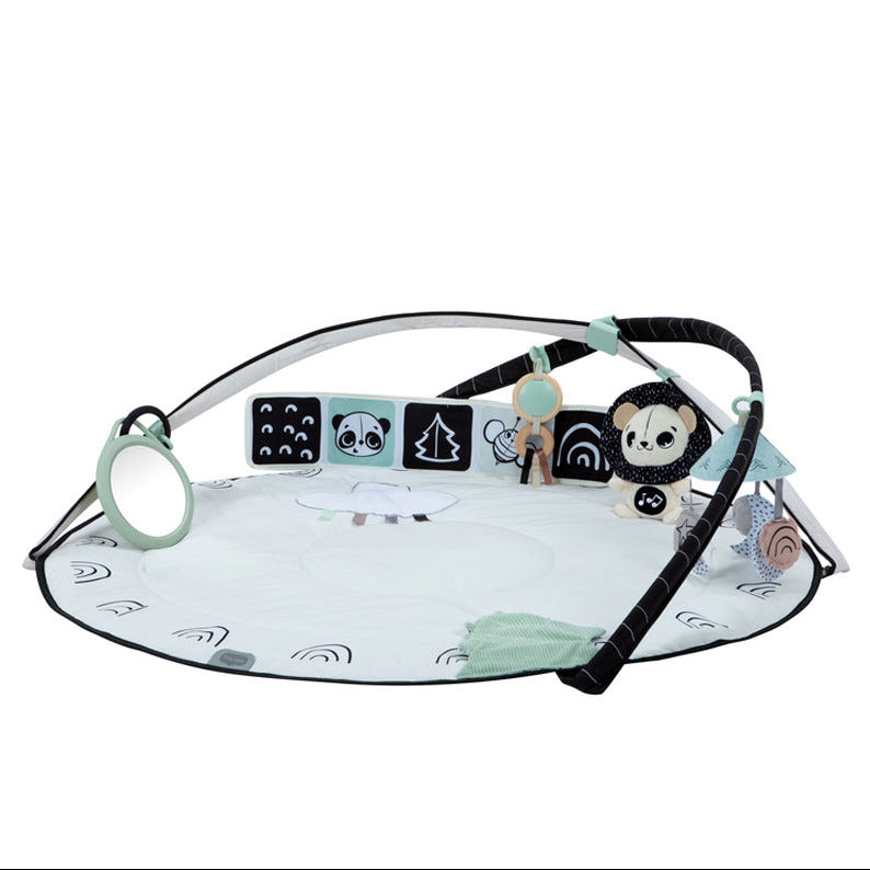 Stílreint og sansaligt spæliteppi, sum er gjørt til at stuðla barninum í menning frá fyrsta degi. Svart-hvíta sniðið stimbrar sjónina, og teppið bjóðar bæði sjónligar, ljóðligar og taktilar upplivingar, sum styrkja motorikk og menning.